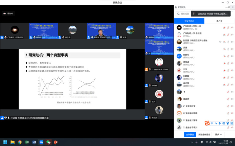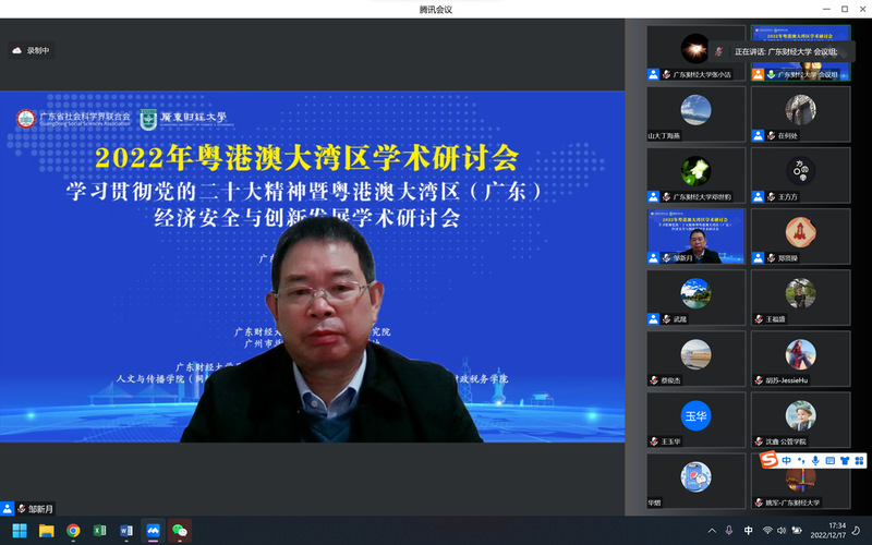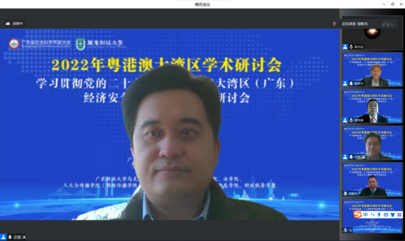 12月17日,由广东省社科联主办、广东财经大学承办,广东财经大学明胜m88官网,明胜m88官网、广州市总体国家安全观教育培训基地(广东财经大学)、《广东财经大学学报》,广东财经大学明胜m88官网、经济学院、金融学院、法学院、人文与传播学院(网络传播学院)、外国语学院、公共管理学院、信息学院、财政税务学院等联合协办的“学习贯彻党的二十大精神暨粤港澳大湾区(广东)经济安全与创新发展学术研讨会”以线上线下相结合的方式如期举行。