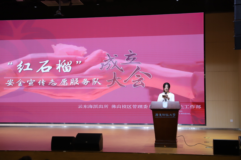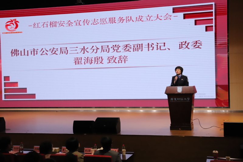 12月1日,红石榴安全宣传志愿服务队成立仪式在佛山校区同心楼报告厅111举行,此次活动是由云东海派出所主办,佛山校区管委会、学工部承办。佛山市公安局三水分局党委副书记、政委翟海殷,云东海街道党工委副书记邝法浓,三水公安分局党委委员、副局长刘浩,三水公安分局副局长鄞智锐,云东海派出所所长叶沛雄,三水公安分局刑侦大队副大队长李锦和,三水区云东海街道综治办副主任陈丹及属地政府部门工作人员出席仪式,佛山校区管委会副主任刘金水以及各办负责人,学工部、校团委等相关部门负责人,“红石榴”安全宣传志愿服务队成员,各学院班级代表参加仪式。