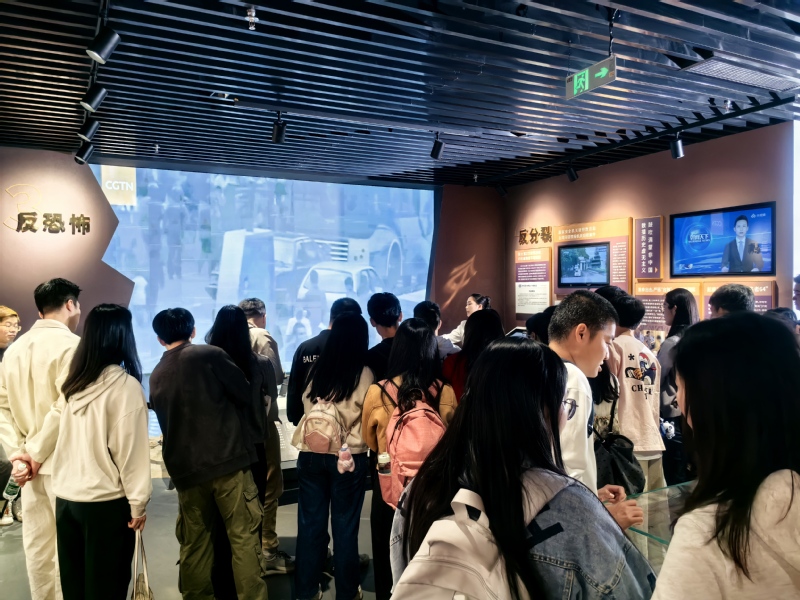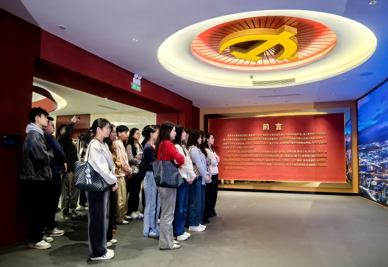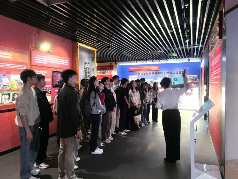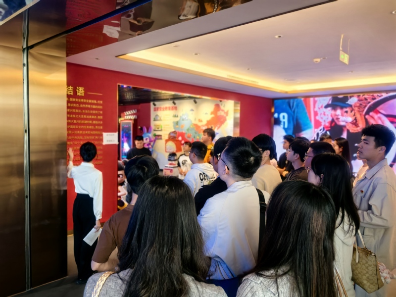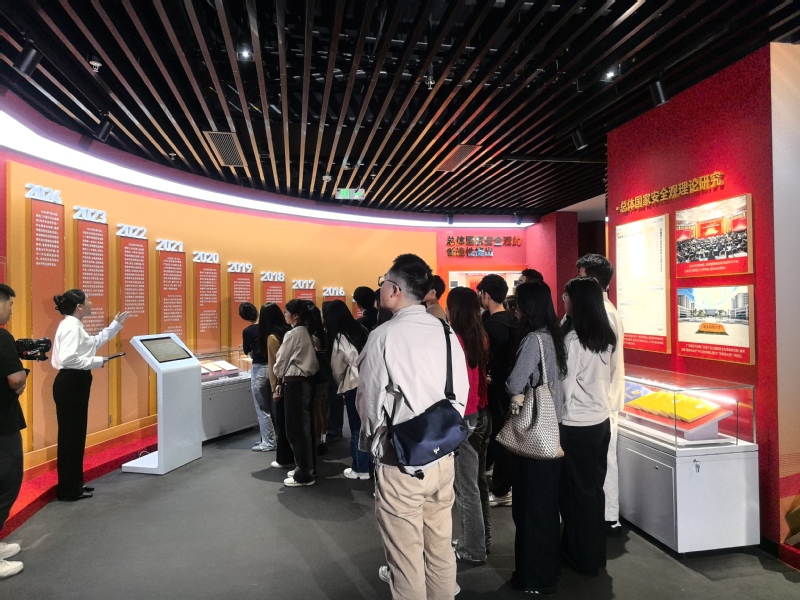 在讲解员的引导下,师生依次参观了展馆的三大主题展区。在“践行总体国家安全观,开创新时代国家安全工作新局面”展区,通过图文展板、历史档案和多媒体影像,系统回顾了总体国家安全观的理论发展脉络与核心要义,生动展现了党的十八大以来党中央统筹发展和安全两件大事的战略部署,以及坚持党对国家安全工作绝对领导的政治原则。