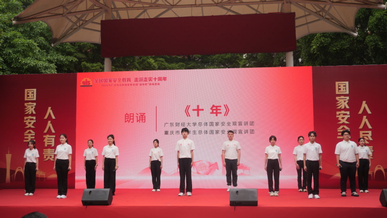 节目《十年》,由广东财经大学与西南政法大学两校总体国家安全观大学生宣讲团成员同台朗诵,以铿锵有力的声音生动诠释了新时代青年学子的爱国主义情怀,展现了“从珠江到长江”青年学子们携手共进、共同守护国家安全防线的责任与担当。此次宣讲是在新时代背景下宣传总体国家安全观的创新性尝试,让观众感受到了十年来我国取得的伟大成就和总体国家安全观的实践伟力,进一步增强了基层社区居民的全民国家安全意识和素养,助力全社会形成维护和塑造国家安全的强大合力。