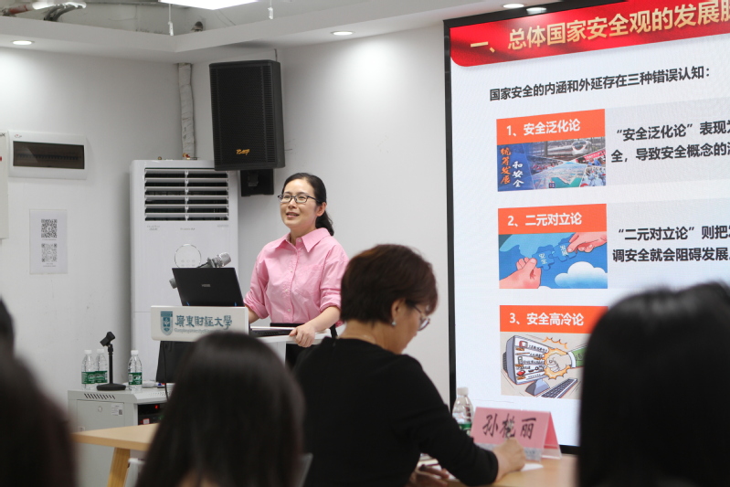 主题讲授环节,袁继红立足国内国际“两个大局”展开讲解。她表示,当前世界形势变化巨大,外部环境复杂,国内发展面临挑战。在这样的形势下,党的十八大以来,总体国家安全观围绕“统筹发展和安全”不断发展,形成了涵盖多领域的安全体系。同时,她提醒大家要避开对国家安全“安全泛化论”“二元对立论”“安全高冷论”的认知误区,明确国家安全的真正含义。