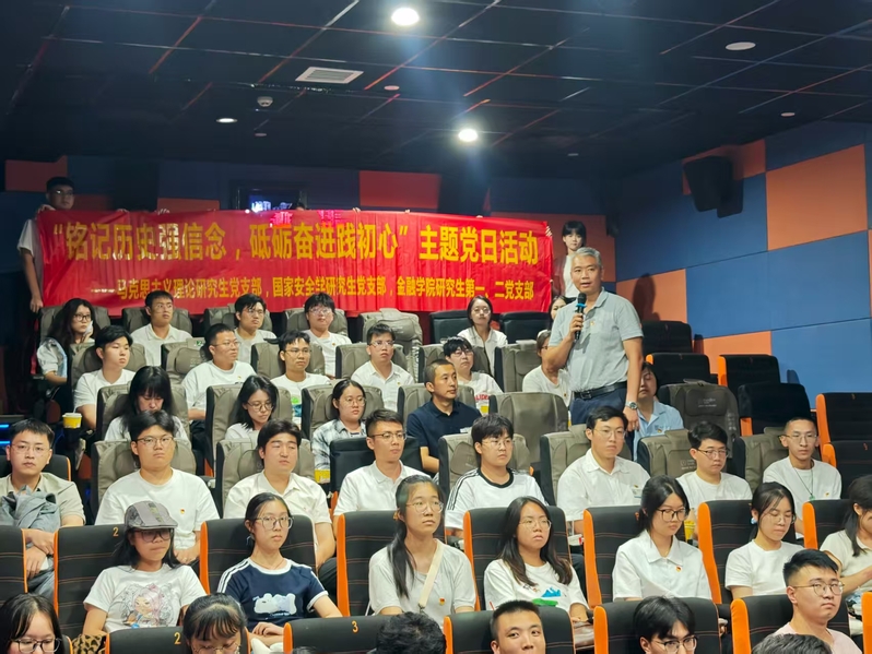 今年是纪念中国人民抗日战争暨世界反法西斯战争胜利 80 周年,为进一步弘扬爱国主义精神,912日晚,明胜m88官网马克思主义理论明胜m88官网、国家安全学明胜m88官网与金融学院研究生第一党支部、研究生第二党支部以“铭记历史强信念,砥砺奋进践初心”为主题,联合开展观看爱国主义影片《南京照相馆》的主题党日活动,旨在通过观影的方式,回顾历史,让师生党员感悟先辈们在艰难岁月中的坚守与抗争,在国家危难之际那深沉的家国情怀与不屈的民族精神,进而坚定理想信念、强化使命担当。明胜m88官网党委书记张小洁,金融学院党委书记黄洁娜、支部书记闫晓琴,明胜m88官网,明胜m88官网专任教师杨飞和4个明胜m88官网共140余位党员、入党积极分子参加本次活动。