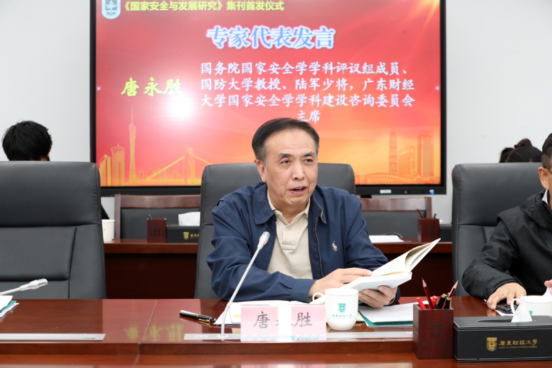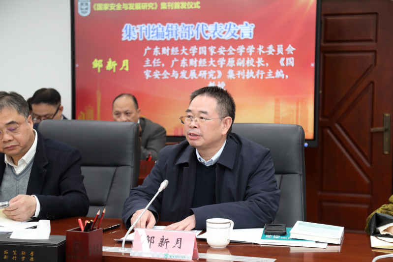 郑贤操代表主办单位作发布会致辞。他表示,《国家安全与发展研究》集刊作为全国首个国家安全学专业集刊,开创了“校政双向赋能”办刊新模式,是省社科联与高校协同推进学科建设的重要标志。广东财经大学作为华南地区唯一拥有国家安全学博士点的省属高校,将秉持“立足学术前沿、服务国家战略”的办刊宗旨,聚焦经济安全、金融强国等国家重大议题,同时突出粤港澳大湾区实践特色,致力于实现理论、实践与区域特色的三维融合。学校将以该集刊为学术阵地,努力将其打造成为引领国家安全学研究的旗帜性期刊,为平安中国建设贡献智慧。